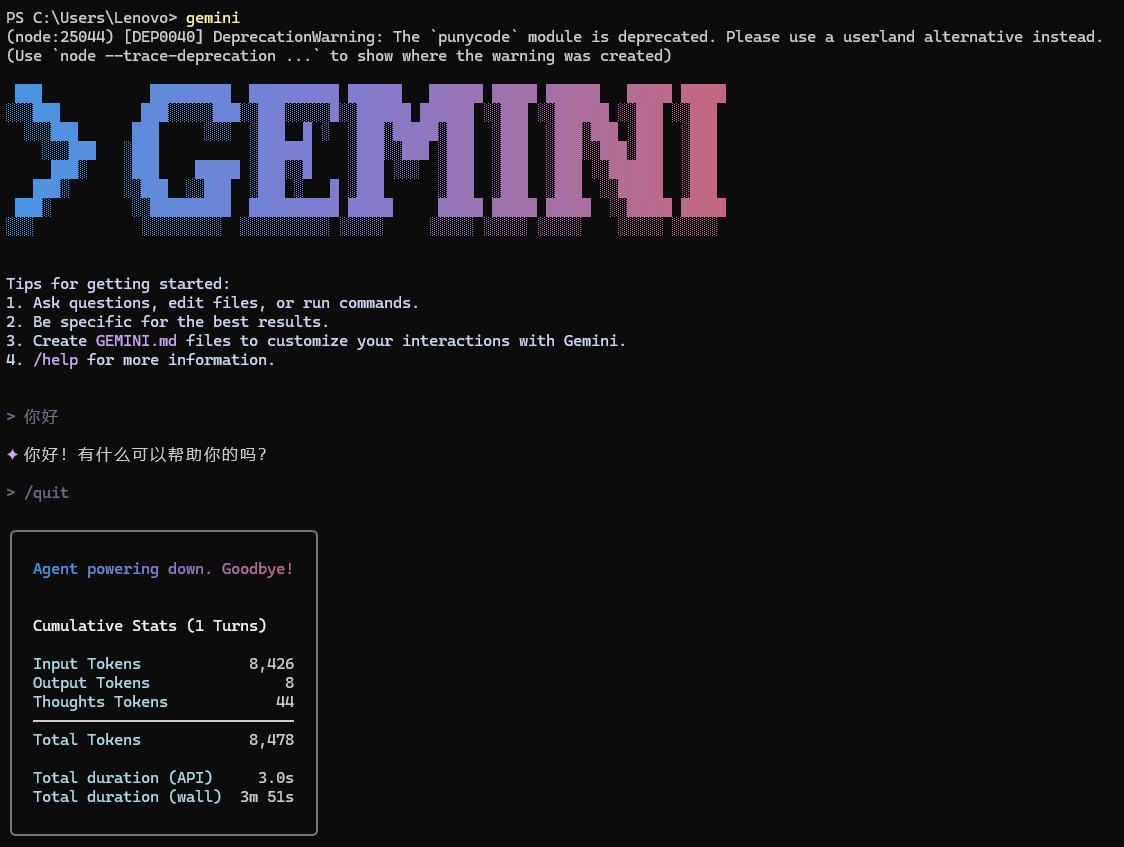 Section titled “设置环境变量”$env:GOOGLE_CLOUD_PROJECT = "<GOOGLE_CLOUD_PROJECT>"$env:GEMINI_API_KEY = "<GEMINI_API_KEY>"