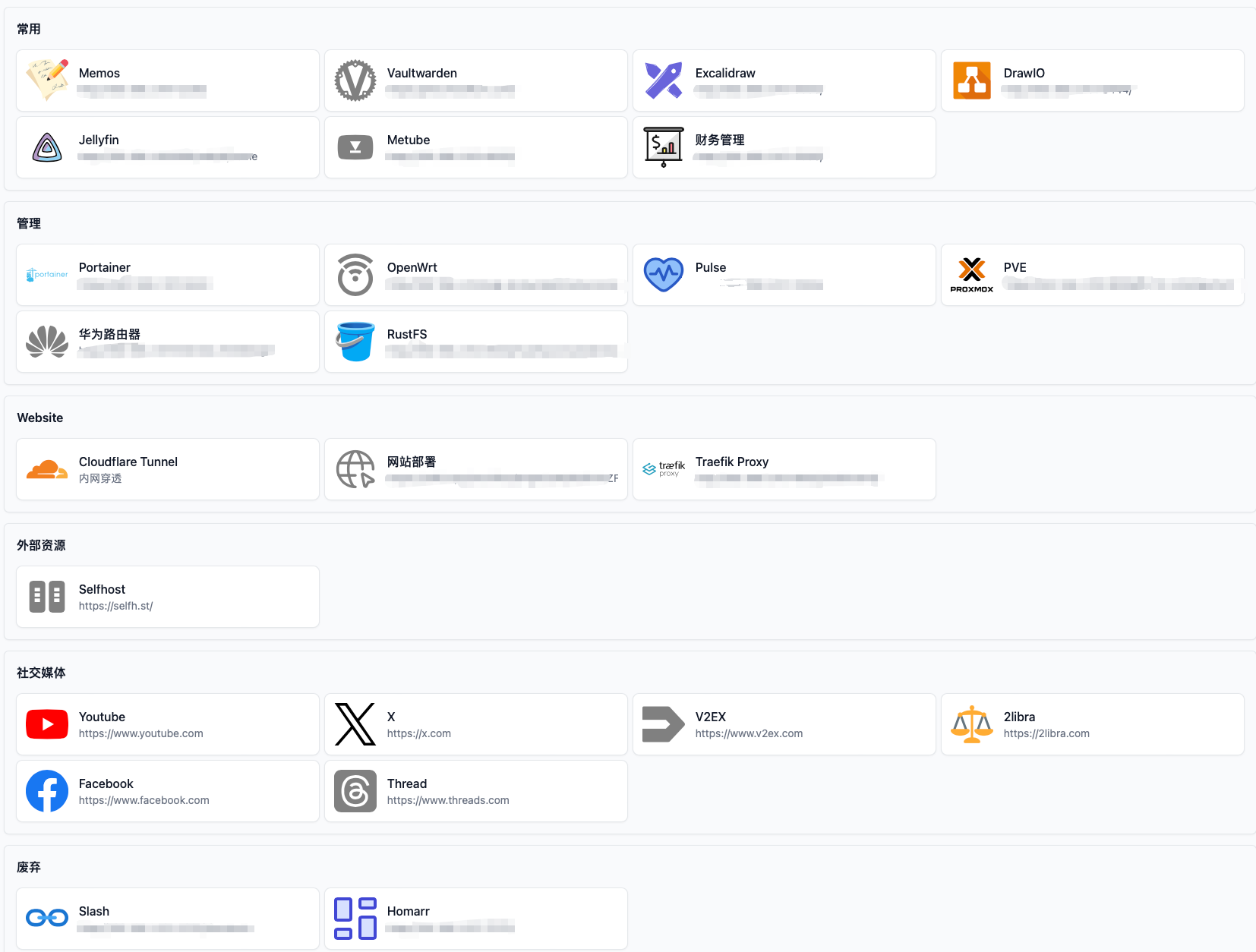 Section titled “Slash 短链跳转”docker run -d --name slash --publish 5231:5231 --volume /home/moatkon/codes/slash/:/var/opt/slash yourselfhosted/slash:latest不建议做导航面板使用,稍微有点重。