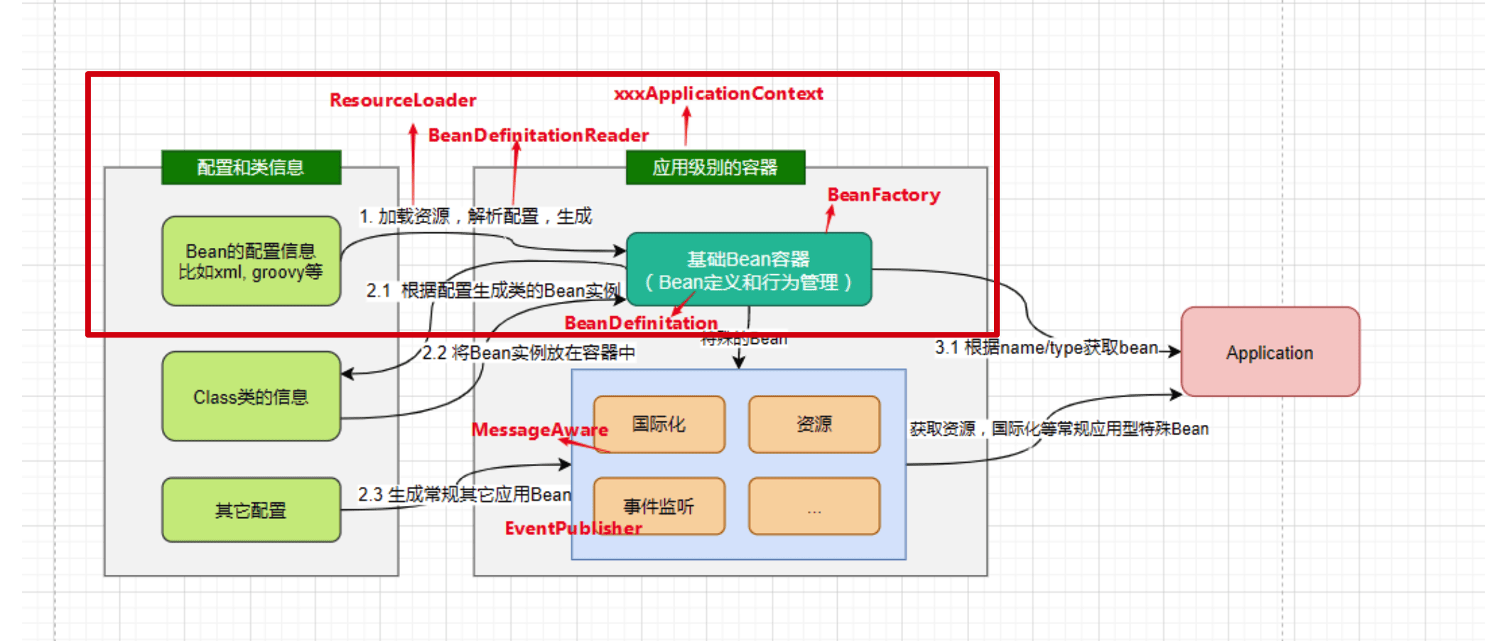- beanDefinition载入: BeanDefinitionReader读取、解析Resource定位的资源成BeanDefinition 载入到ioc中(通过HashMap进行维护BD)