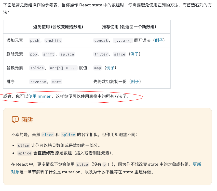 Section titled “更新 state 中的数组”学习文档: https://zh-hans.react.dev/learn/updating-arrays-in-state
